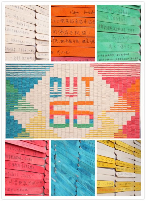 4月14日,八角楼前竖立起一组校庆专属手势照片墙,而整个墙体的中间部分却是一片空白,那就是校学生会为全校师生及校友准备的一份礼物。校学生会事先准备了近万根彩色祝福签,在校庆前的几天发给了全校师生,让大家亲手写上对母校的祝福并在4月15日当天粘贴在底板上,最后完成一幅DUT66的创意拼图献礼大工。